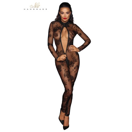 Combinaison intégrale totalement transparente en tulle floqué de motifs de fleurs, et ouverture triple zip.