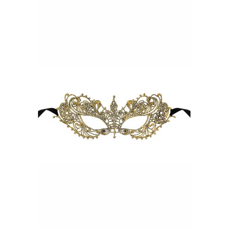 Loup / masque souple de couleur dorée en dentelle brodée, avec rubans satinés pour le serrage.
