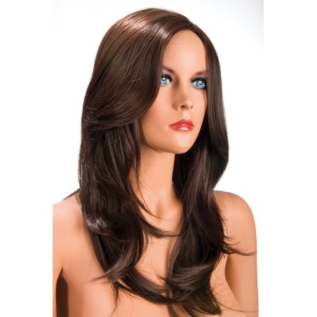 Perruque châtain aux cheveux longs ayants un aspect naturel. Elle tombe à merveille sur les épaules.