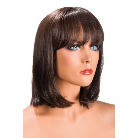 Perruque châtain à la coupe moderne. Camila est mi-longue et sa frange effilée retombe presque sur les yeux. Sa mèche effilée tombant au dessus des yeux les mets parfaitement en valeur.