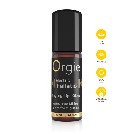 "Orgie Electric Fellatio Lip Gloss" est le gloss / Brillant à lèvres excitant parfumé au Tutti Frutti, avec effets vibrants et picotements instantanés, de la marque de cosmétique érotique Orgie.